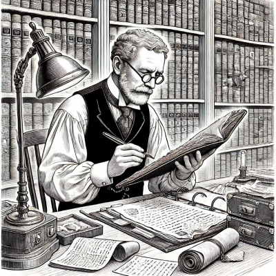 • Он изучает в архиве ценные исторические материалы.
