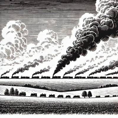 • На горизонте виднелся дым — то шли паровозы.